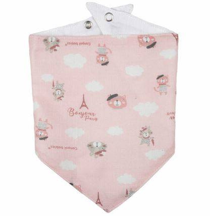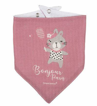 Śliniak muślinowy Bonjur Paris Canpol Babies został wykonany z miękkiego i oddychającego muślinu bawełnianego i osłoni ubranko maluszka przez zabrudzeniem. Posiada wygodne zapięcie na zatrzaski z możliwością regulacji.