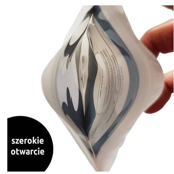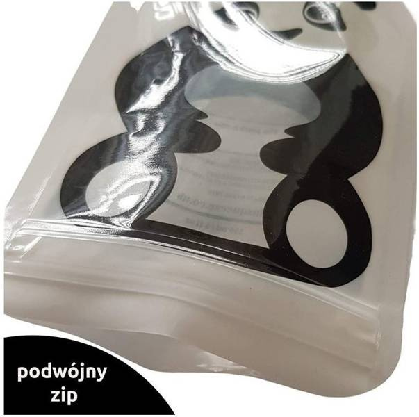 Nowe saszetki to nie tylko innowacja w postaci dolnego zamknięcia na zip, ale także nowy miękki materiał, nowy wzór - elegancka panda, której przezroczysty brzuszek ułatwia zobaczenie zawartości.