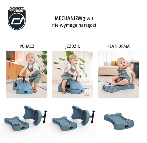 Rozwój małego dziecka przebiega w ekspresowym tempie, nawet nie zauważysz, kiedy Twoja pociecha zacznie siadać, raczkować czy stawiać pierwsze kroki. Warto już od początku wspierać rozwój malucha, organizując zabawy ruchowe. My First, czyli nowy produkt od Scootandride, to wielofunkcyjny jeździk, który sprawdzi się świetnie jako zabawka wspierająca rozwój motoryki dużej. Scootandride My First jest zabawką 3w1- można jej używać na kilka sposobów- jako pchacza dla najmłodszych, klasycznego jeździka lub deski na kółkach, a każda z wersji z pewnością przypadnie każdemu dziecku i posłuży na długo.