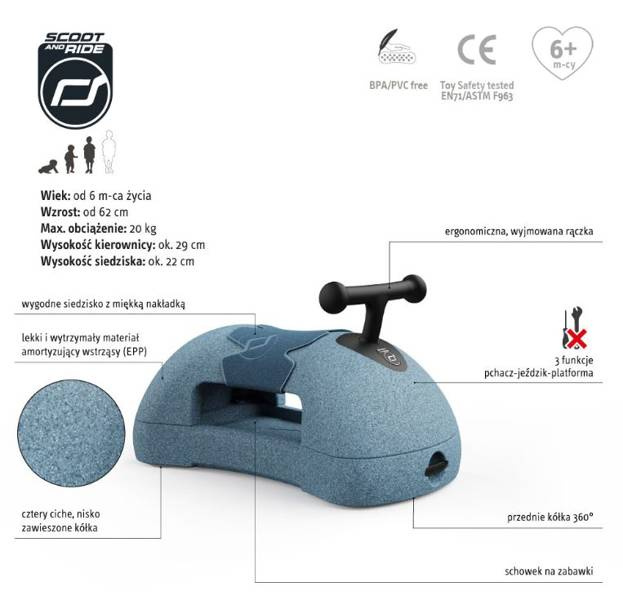 Scootandride My First waży niecały kilogram , ale jest trwały i spełnia rygorystyczne normy bezpieczeństwa. To zabawka bezpieczna dla najmłodszych (od około 6 miesiąca życia), która posłuży Wam naprawdę długo. Może być użytkowana przez dzieci do 20 kg wagi.