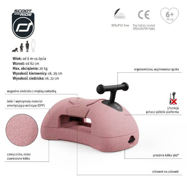 Scootandride My First waży niecały kilogram , ale jest trwały i spełnia rygorystyczne normy bezpieczeństwa. To zabawka bezpieczna dla najmłodszych (od około 6 miesiąca życia), która posłuży Wam naprawdę długo. Może być użytkowana przez dzieci do 20 kg wagi.