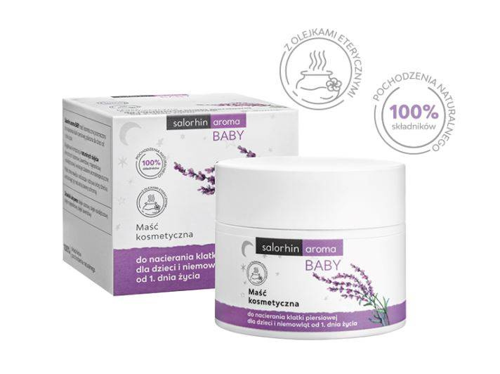 Salorhin Aroma Baby to maść do nacierania klatki piersiowej dla dzieci i niemowląt, która, dzięki zawartym w niej olejkom eterycznym, wykazuje działanie aromaterapeutyczne. Skład maści Salorhin Aroma Baby jest całkowicie naturalny (100% składników naturalnych!), sprawdzi się więc już od pierwszych dni życia. Dodatkowo maść świetnie nawilża i odżywia skórę najmłodszych, dzięki zawartym w niej maśle shea.