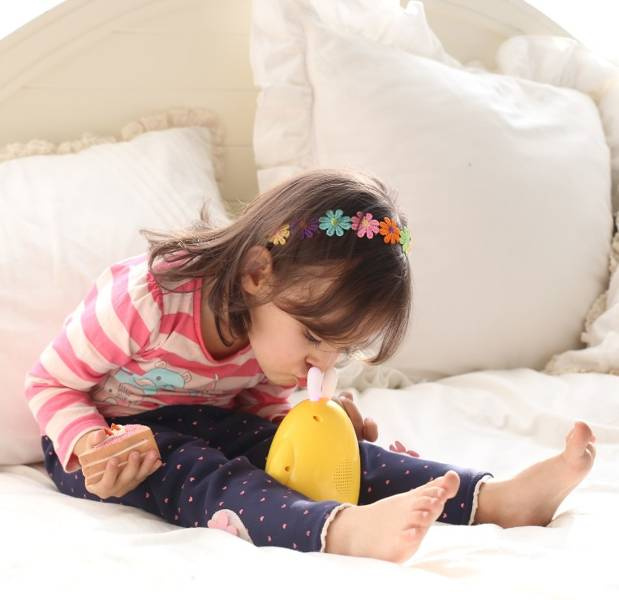 Śpiewa piosenki, czyta bajki, odtwarza muzykę do snu oraz rytmy i dźwięki, a także służy jako lampka nocna.