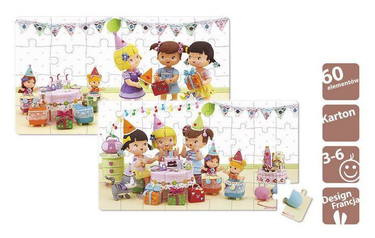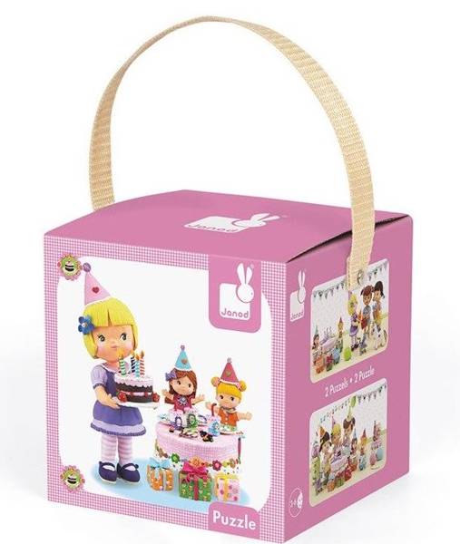 Zestaw puzzli francuskiej marki Janod składa się z dwóch kompletów układanek o różnym stopniu trudności – jeden ma 24, drugi 36 elementów. Oba obrazki przedstawiają dziewczynkę – Juliette podczas jej przyjęcia urodzinowego: w chwili przyjmowania prezentów od przyjaciółek i podczas delektowania się tortem w ich towarzystwie.