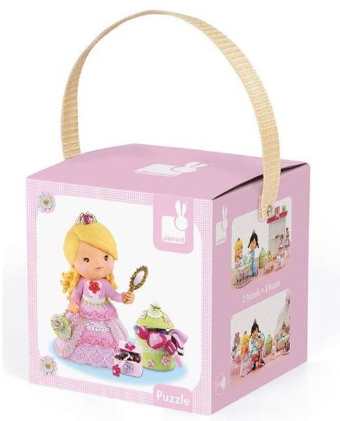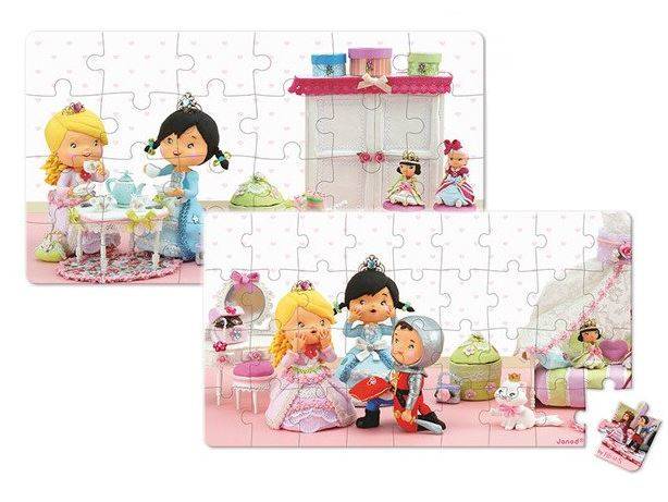 Zestaw puzzli francuskiej marki Janod składa się z dwóch kompletów układanek o różnym stopniu trudności – jeden ma 24, drugi 36 elementów. Oba obrazki przedstawiają księżniczkę Rose w jej pałacowych komnatach: podczas herbatki w towarzystwie damy dworu i kiedy oświadcza się jej przystojny rycerz.