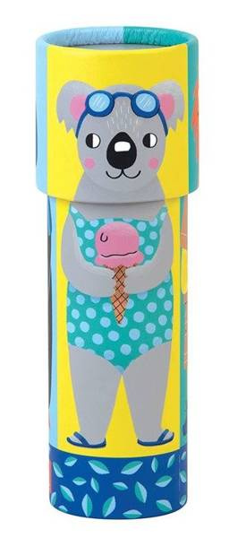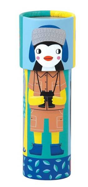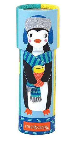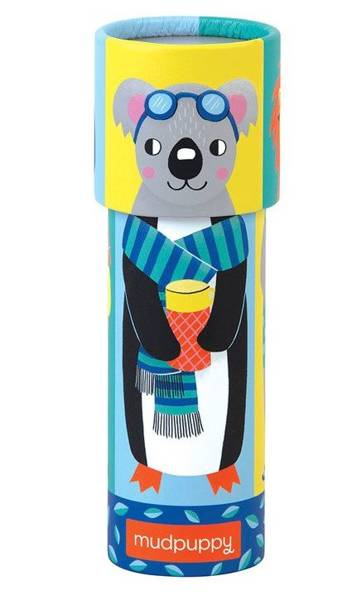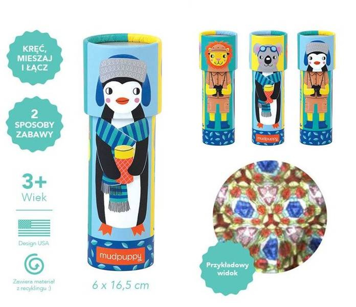 Kalejdoskop Mix&Match Zwierzęta świata amerykańskiej marki MUDPUPPY to niebanalna zabawka, która daje wiele możliwości. Oprócz wciągających, stymulujących pracę oka obserwacji barwnych, symetrycznych figur, zmieniających się przy każdym obrocie kalejdoskopu, na jego zewnętrznej stronie znajdują się trzy dwuelementowe układanki z postaciami uroczych zwierzaków – pingwina, koali i lwa, które można komponować (góra + dół) w dowolny sposób. Autorką ilustracji jest Emily Balsley – artystka z Wisconsin. Kalejdoskop ma kształt rurki, jest wykonany z kartonu i wygląda bardzo estetycznie. Idealnie nadaje się na prezent.