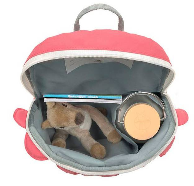 Plecak uszyto z wysokiej jakości, trwałych materiałów, tylna ścianka jest wzmocniona, ale nadal miękka w kontakcie z plecami dziecka. W górnej części znajduje się uszko do zawieszenia plecaka, np. na haczyku w szatni. Dość szerokie, grubsze i miękkie ramiączka zapewniają wygodę noszenia. Z przodu, na klatce piersiowej dodatkowo wyposażone są w stabilizujące i odciążające plecy zapięcie na zatrzask – jego wysokość, podobnie jak długość ramiączek, można regulować i na bieżąco dopasowywać do wzrostu dziecka. Uszko, paski oraz ułatwiające dziecku samodzielne zapinanie sznureczki przy suwaku mają kolor szary. Materiał plecaka łatwo się czyści i jest odporny na wilgoć.