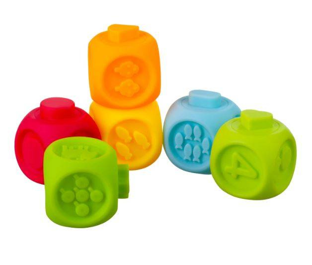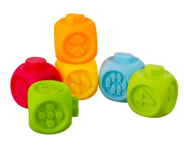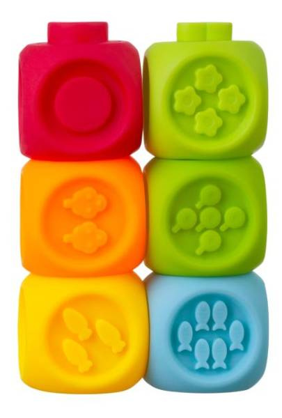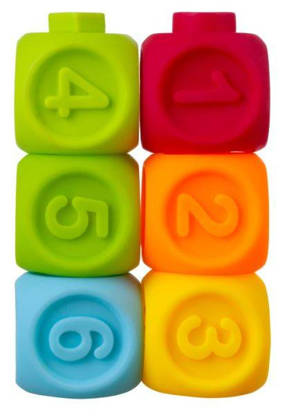W zestawie znajduje sie 6 różnokolorowych miękkich klocków, które można ze sobą łączyć.