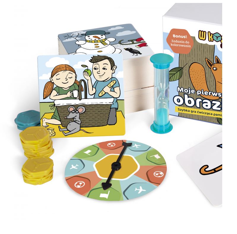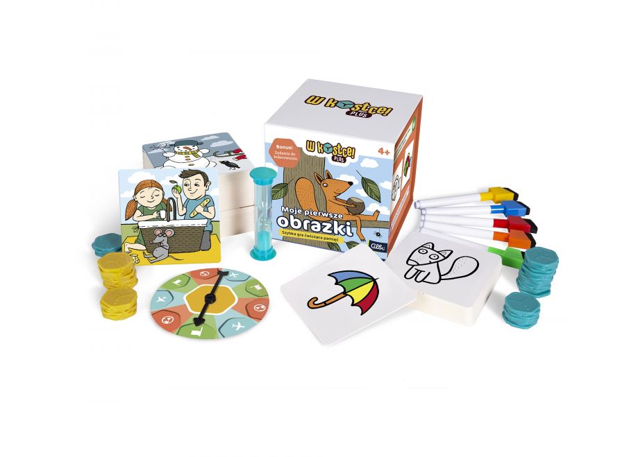 W Kostce! Plus to seria szybkich gier edukacyjnych ćwiczących pamięć i spostrzegawczość, przeznaczonych dla dzieci od 4 roku życia. Z kostek każdy może dowiedzieć sie ciekawych faktów o świecie, a także poznać litery czy ćwiczyć umiejętności matematyczne i percepcyjne. Wszystko to w sposób przyjazny dziecku: celem jest zapamiętanie jak największej liczby faktów na danej karcie tematycznej w ciągu dziesięciu sekund. Prawidłowe odpowiedzi zapewniają bonusowa rundę, ale przed wami również wyzwanie w postaci wielorazowych kart do malowania, które z pewnością sprawdzą waszą pamięć wzrokową! Gra zawiera karty z obrazkami, które musisz zapamiętać, a następnie odpowiednio pokolorować za pomocą pisaków.