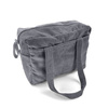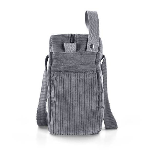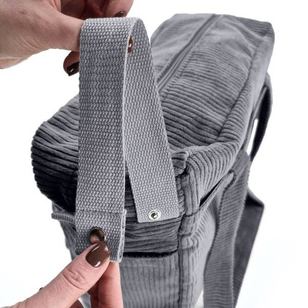 Doszyty na stałe w bocznej części torby pasek z napą pozwala na zapięcie go wokół drążka, tworząc w ten sposób uniwersalny i łatwy w montażu zaczep torby do wózka. Torbę możemy nosić zarówno na ramieniu, jak i w ręce.