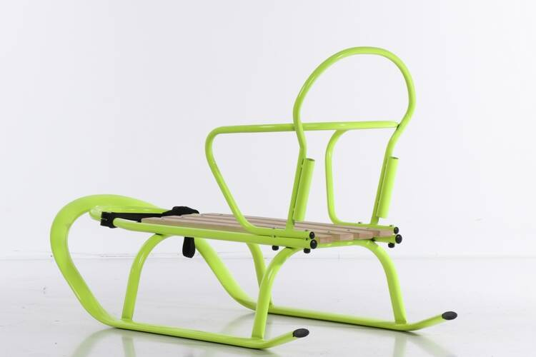 Płozy są szeroko rozstawione, co minimalizuje ryzyko wywrotki. Charakterystyczne dla sanek Linea jest przykręcane oparcie, możliwość dopięcia pchacza oraz płaska płoza.