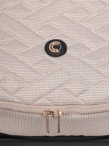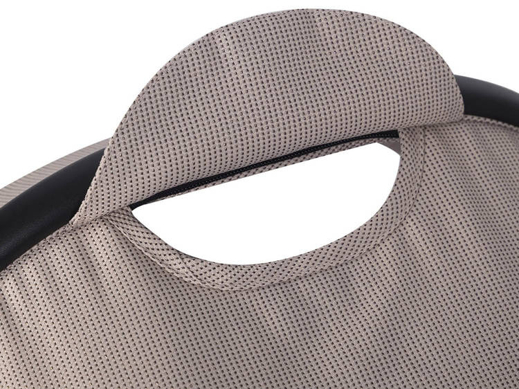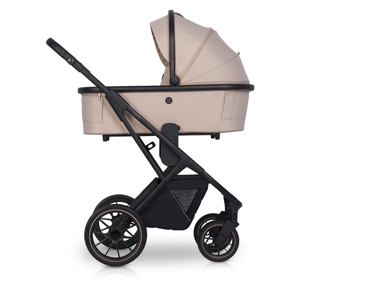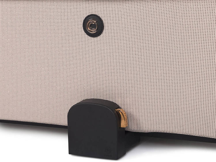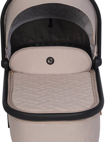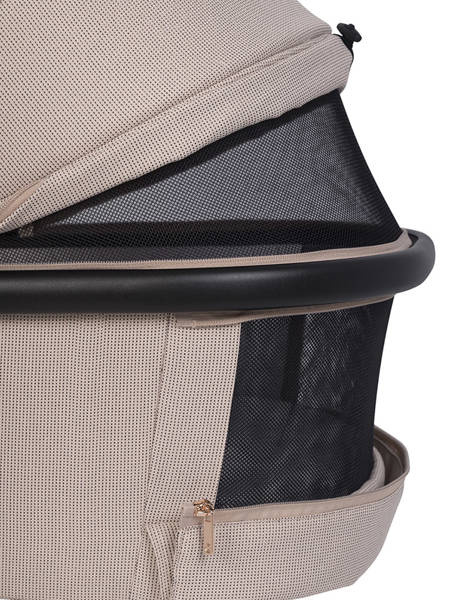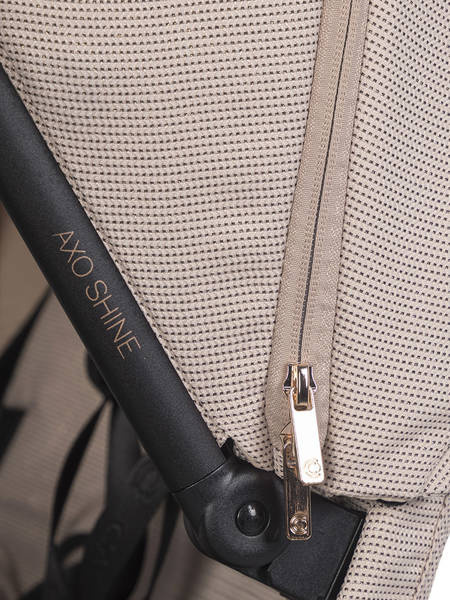 Dodatkową funkcją wysokiej gondoli do wózka AXO SHINE są przyciski z pamięcią (tzw. memory buttons), które pozwalają na wypięcie gondoli ze stelaża przy użyciu jednej ręki. Wystarczy, że wciśniesz estetyczne miedziane przyciski po obu stronach gondoli i uniesiesz gondolę, trzymając za wygodny uchwyt w budce.