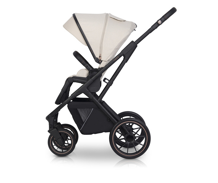 Wózek AXO SHINE podobnie jak popularna kolekcja STYLE posiada regulację wysokości prowadnicy. Funkcja ta umożliwia wygodne prowadzenie wózka zarówno wysokim jak i niskim rodzicom. Przyciski regulacji zostały udekorowane eleganckimi metalowymi sygnetami CAVOE w kolorze ROSE GOLD, dzięki czemu ta niezwykle praktyczna funkcja stała się również dekoracją wózka.