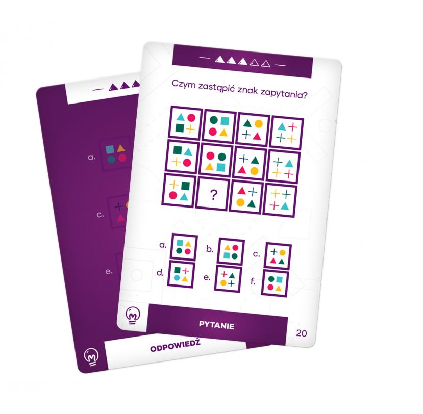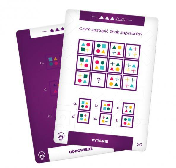 W pudełku znajdziesz 50 kart – bogaty wybór zadań dotyczących odbioru wizualnego i logicznego myślenia. Różne rodzaje pytań dotyczących figur geometrycznych mają odpowiedź w postaci jednego słowa lub są testem wyboru. Rozwiązywanie zadań z elementami graficznymi utrzymuje mózg w formie, ponieważ wykorzystuje nie tylko zdolność wyobrażania sobie ruchu obiektów, ale również utrzymuje w pamięci informacje przestrzenne. Zadania są podzielone na pięć poziomów trudności.