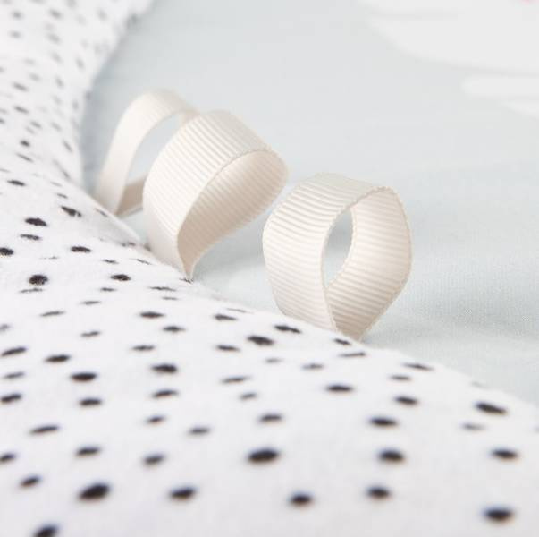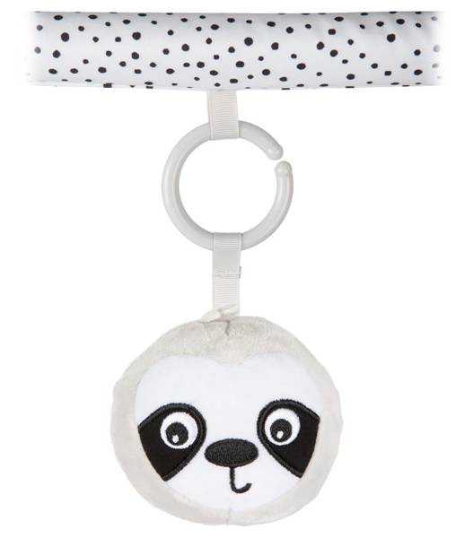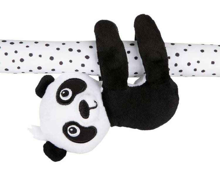 w dowolnym miejscu i gdy Maluch podrośnie będzie zachęcało do leżenia na brzuszku oraz panda z piszczkiem i łapkami na rzepy, dzięki którym można połączyć je ze sobą i objąć nimi pałąk maty lub szczebelek dziecięcego łóżeczka.