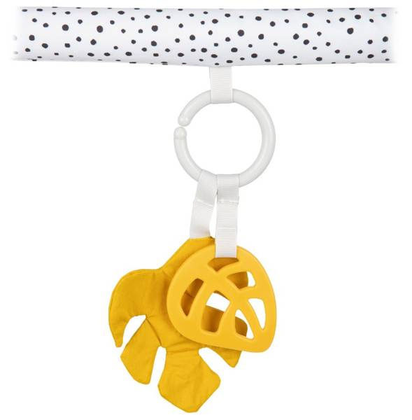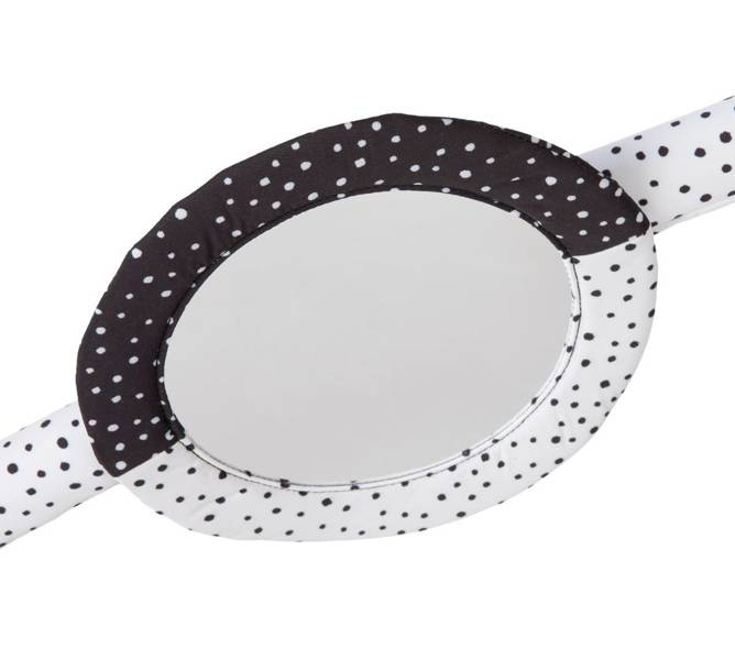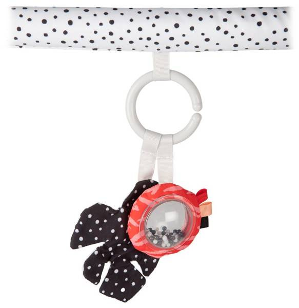 i wyciągania do nich rączek, pomaga rozwijać sprawność ruchową, wzmacnia mięśnie i ćwiczy zdolności manualne. Zabawki są zawieszone na pałąkach, które można łatwo zdemontować, aby wyprać matę lub zabrać ze sobą wszędzie tam, gdzie chcemy stworzyć dziecięcą przestrzeń, zapewniając bezpieczny i czysty kawałek podłogi. Zabawki można odpinać i podać do zabawy: 2 grzechoczące buzie zwierzątek, 2 szeleszczące listki z lusterkiem otoczonym kolorowymi metkami i grzechotką oraz z gryzakiem, który przyniesie ulgę podczas ząbkowania, duże odpinane lusterko, które można przypiąć