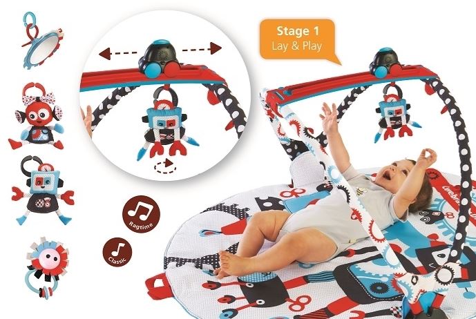 w tę i z powrotem! Dwa różne tryby melodii oraz wiele akcesorii sprawia że mata Gymotion® oferuje wiele korzyści wpływających na rozwój malucha. Posiada także proste składanie wygodne w przechowywaniu i przewożeniu.