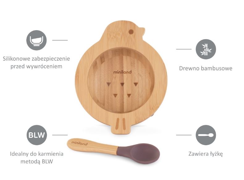 Drewniana miseczka z przyssawką i łyżeczką w zestawie w formie ptaszka pochodzi z najnowszej kolekcji Eco-friendly i jest idealny dla małych smakoszy.