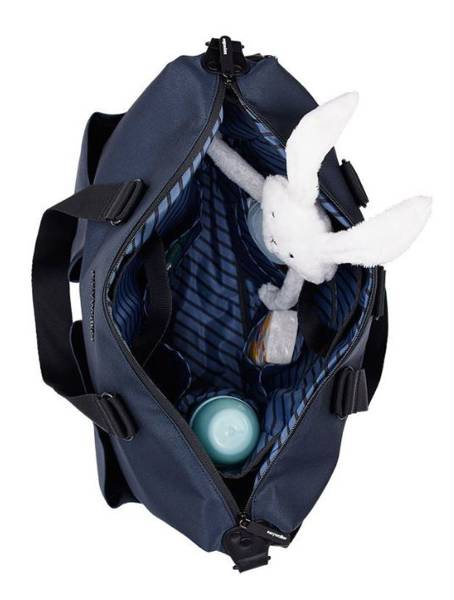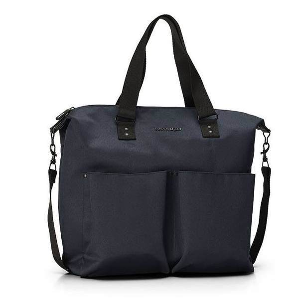 Komora główna jest zapinana na suwak, wewnątrz niej znajduje się kilka kieszonek, w tym dwie z gumowanymi brzegami, ułatwiającymi utrzymanie pionie butelek z mlekiem lub napojami. Z łatwością posegregujesz w niej pieluszki, chusteczki, ubranka i inne artykuły pierwszej potrzeby. W komplecie jest także poręczna, składana mata do przewijania oraz wyjmowany organizer (można go też używać osobno) – oba akcesoria w grafitowo-czarne ukośne paski z eleganckim czarnym obszyciem. Na zewnątrz w tylnej ściance torby znajduje się nieduża kieszonka na suwak, w której pomieścisz drobiazgi, np. klucze czy telefon. Dwie otwarte kieszenie z przodu będą doskonałym miejscem na pluszaka, śliniak czy inną rzecz, którą potrzebujesz mieć pod ręką.