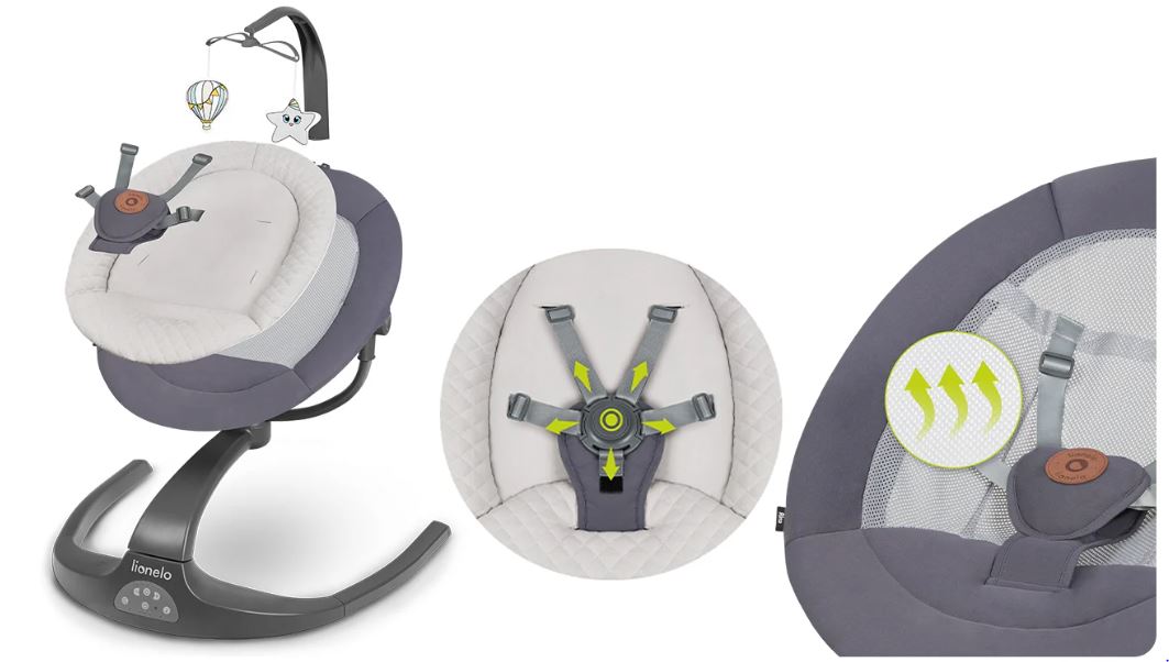 Dziecko może przebywać w pozycji leżącej - idealnej do wypoczynku lub pół leżącej kiedy jest aktywne i ciekawe świata - bujak Lionelo Rina posiada bowiem dwustopniową regulację pochylenia siedziska. Wbudowana pozytywka z 12 spokojnymi melodiami i pałąk z 2 zabawkami z powodzeniem zajmą pociechę.