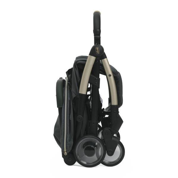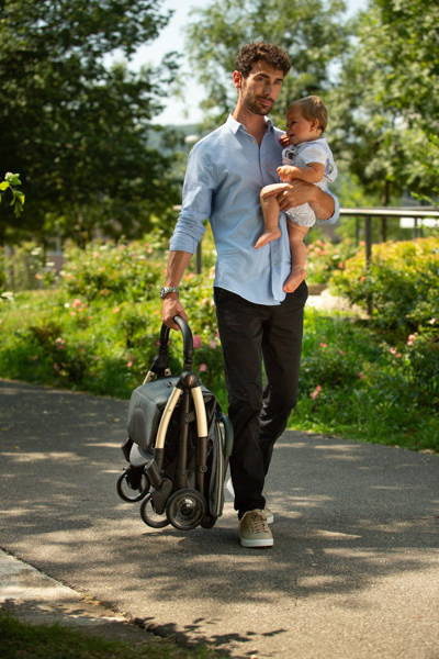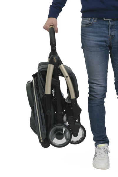 Jeśli składasz wózek, to w 95 % przypadków w jednej ręce masz właśnie wózek, a w drugiej dziecko. Na szczęście, jeśli masz Chicco Goody Plus, jedna ręka w zupełności ci wystarczy. Wciśnij przycisk, a wózek złoży się sam. Po złożeniu stoi samodzielnie, dzięki czemu tapicerka nie brudzi się od podłoża. Złożoną spacerówkę możesz podnieść za pałąk bezpieczeństwa niczym zwyczajną walizkę.