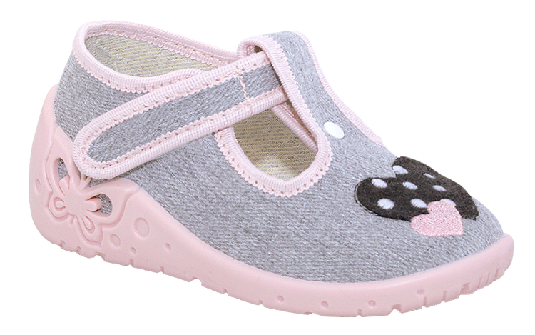 Obuwie dziecięce zapinane na klamerkę w modnym kolorze. Wnętrze buta wykonane z naturalnej tkaniny bawełnianej. Usztywniana piętka. Elastyczna podeszwa wykonana z bezftalanowego tworzywa. Buty ozdobione kolorowym haftem. Wkładka wykonana z naturalnej skóry oraz elastycznej pianki. Pianka zawiera węgiel aktywny. Skóra absorbuje nadmiar wilgoci a węgiel aktywny pochłania nieprzyjemne zapachy zapewniając stopie uczucie świeżości.