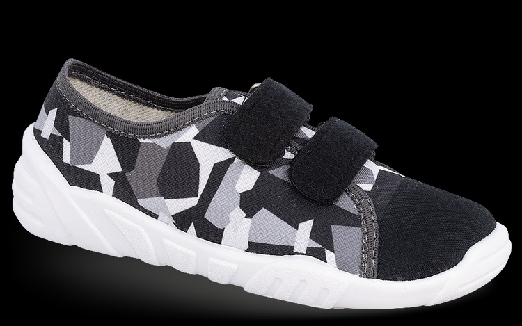 Obuwie chłopięce zapinane na rzep. Buty wykonane z naturalnej bawełny. Usztywniana piętka. Spód wykonany z białego bezftalanowego tworzywa. Wkładka wykonana z naturalnej skóry oraz elastycznej pianki zawierającej węgiel aktywny. Skóra absorbuje nadmiar wilgoci, a węgiel aktywny pochłania nieprzyjemne zapachy zapewniając stopie uczucie świeżości.