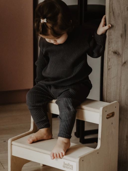 Drewniane schodki to produkt, który możemy używać „solo”, w postaci kuchennego pomocnika lub zestawić z bujakiem i blatem BabyWood, tworząc tym samym nieograniczoną przestrzeń do zabawy.