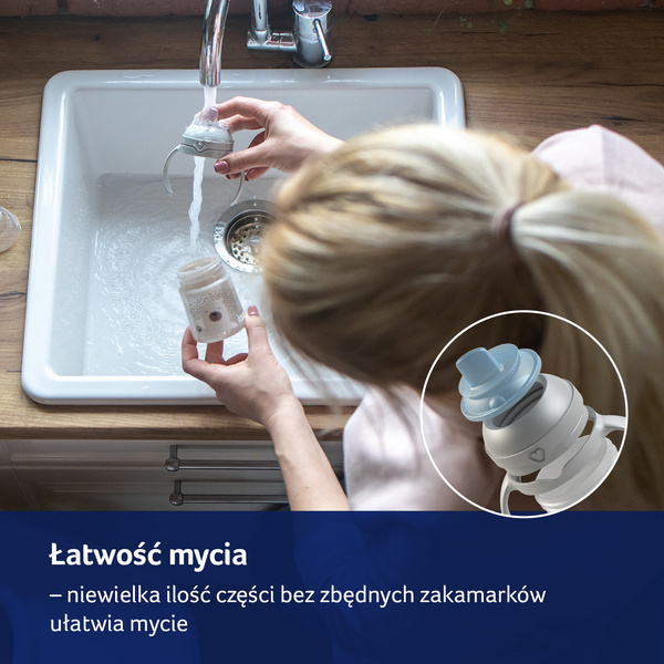 Ustnik łatwy do wyciągnięcia, a kubek nie ma zbędnych zakamarków, przez co można szybko umyć wszystkie części.