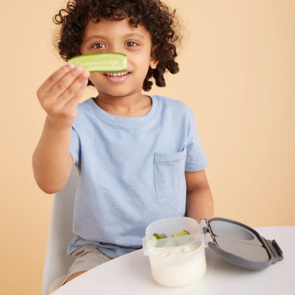 To wyjątkowo praktyczny pojemnik śniadaniowy dla twojego dziecka. Dzięki silikonowej uszczelce możesz zapakować do niego dip, mus owocowy, lub ulubiony jogurt twojego dziecka. Pudełko posiada dwie szczelne przegrody, a w większej zmieści się całe jabłko. Łatwe otwieranie przy pomocy klipsa, daje twojemu dziecku pewność odnośnie tego, czy pudełko zostało zamknięte i może je bezpiecznie odłożyć do plecaka.