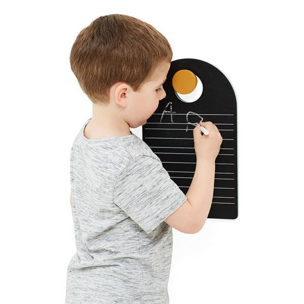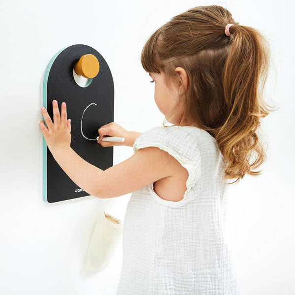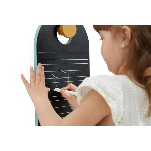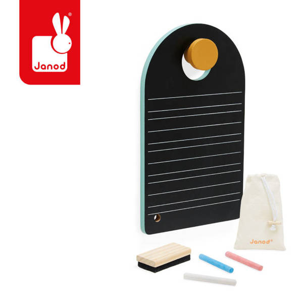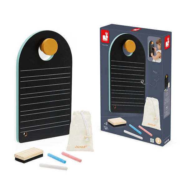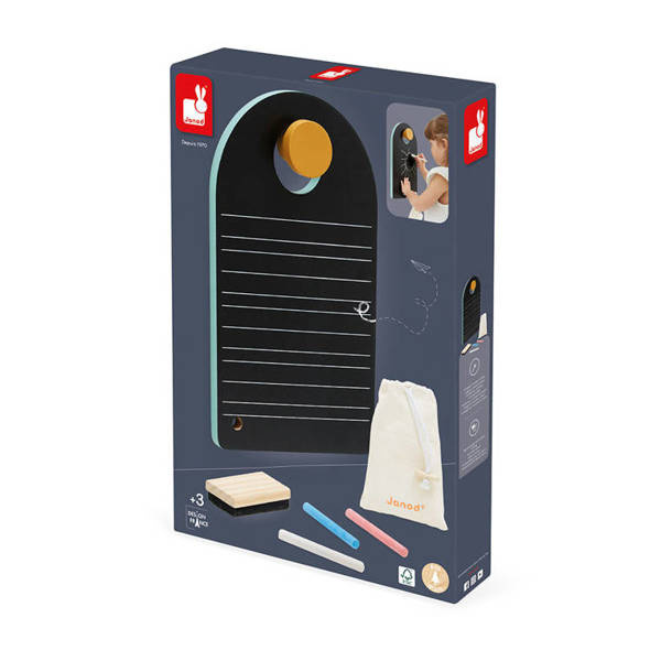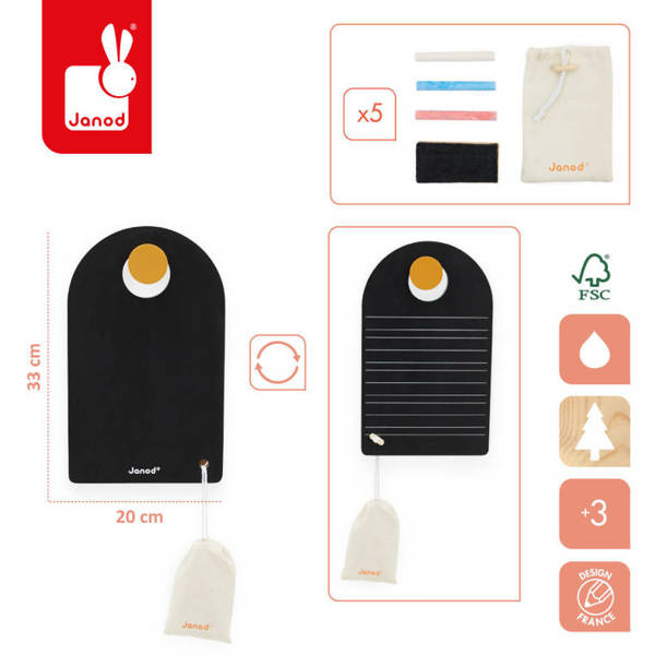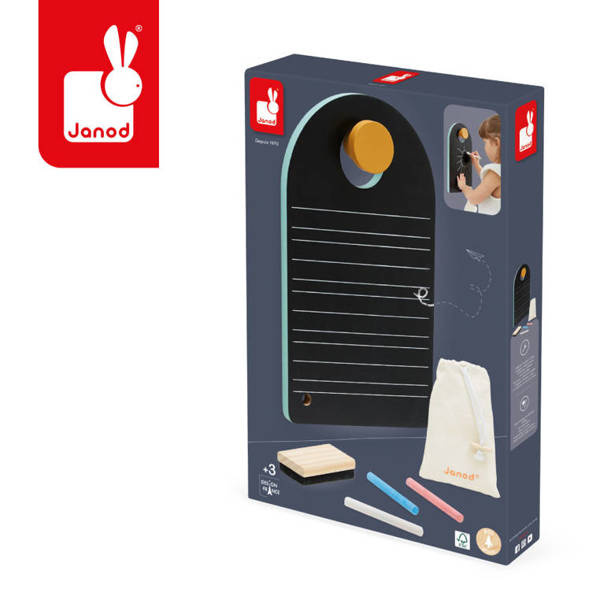 Drewniana przenośna tablica francuskiej marki JANOD to doskonały prezent dla małego ucznia i artysty. Ta dwustronna tablica ma 2 powierzchnie: gładką czarną stronę np. do rysowania i czarną w białe linie do nauki pisania pierwszych słów czy zdań. Ze względu na poręczne rozmiaru jest łatwa do przenoszenia, dzięki czemu można ją zabrać wszędzie! Ale można ją także powiesić na ścianie lub drzwiach pokoju. W zestawie znajduje się bowiem drewniany wieszak, śrubka i kołek. Wśród akcesoriów są ponadto: 3 kredy (biała, niebieska i różowa), gąbka do zmazywania z drewnianym uchwytem oraz bawełniany woreczek na przechowywanie tych dodatków. Co więcej, woreczek ten dzięki kołeczkowi na końcu zaciskowego sznureczka można zamocować w specjalnym otworze przy tablicy, co znacznie ułatwia utrzymanie porządku. Tablica ma zaokrąglony u góry kształt i oryginalny niebieski brzeg. Zabawka rozwija wyobraźnię, zdolności manualne i artystyczne dziecka. Pomaga w nauce pisania i liczenia, jest doskonałym narzędziem do nauki i ozdobą pokoju dziecka.