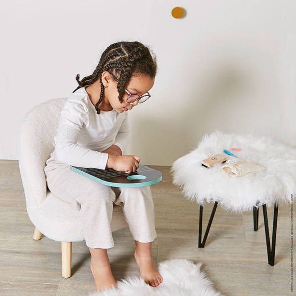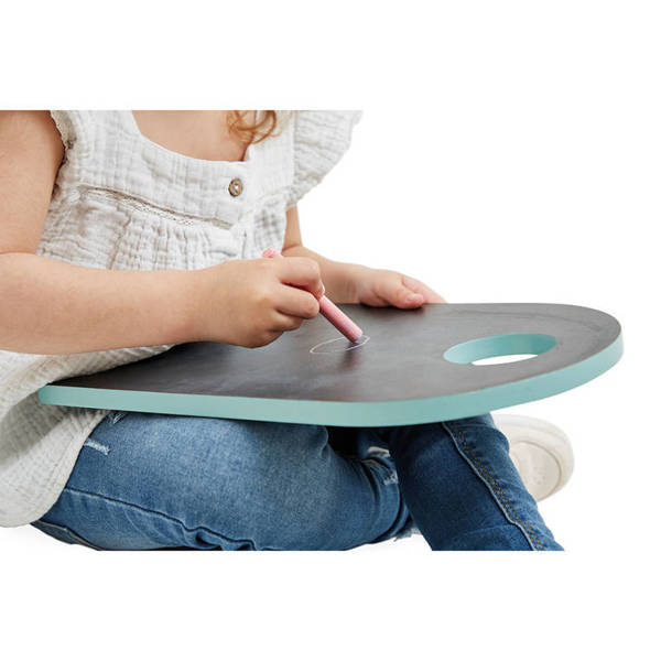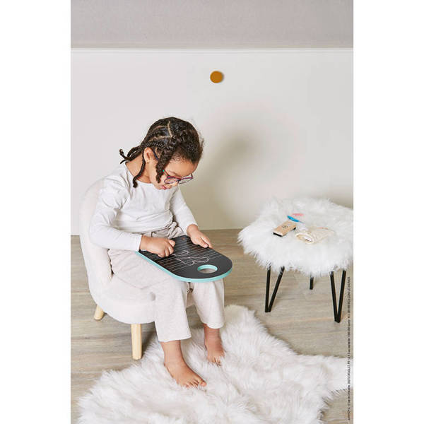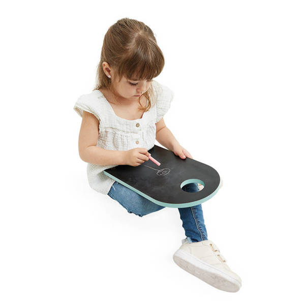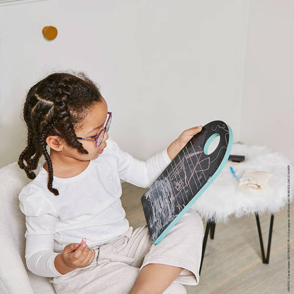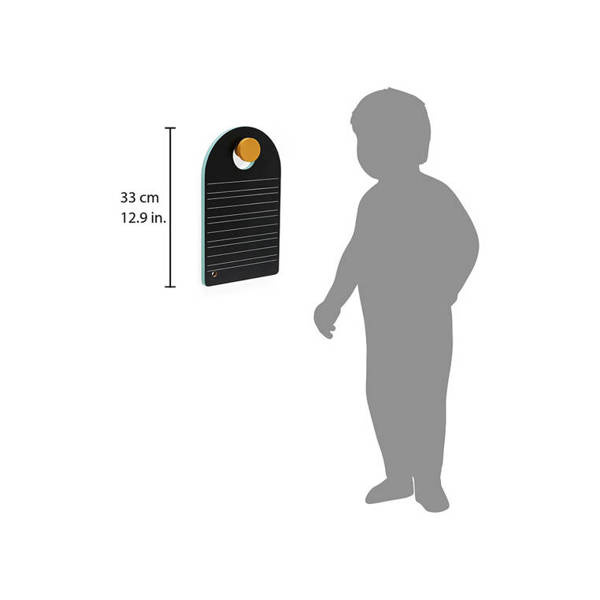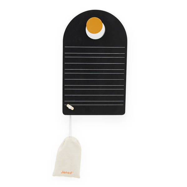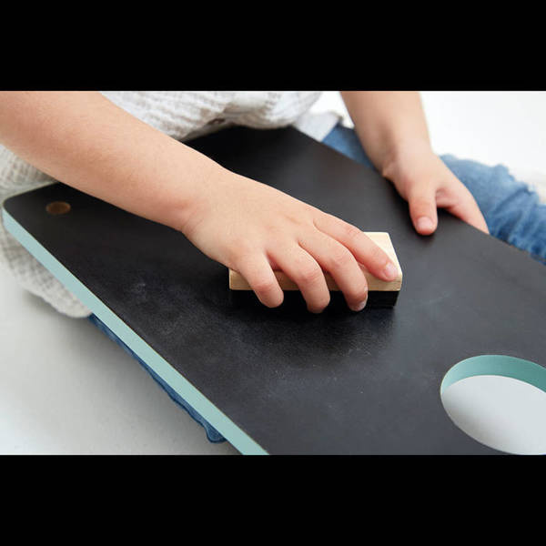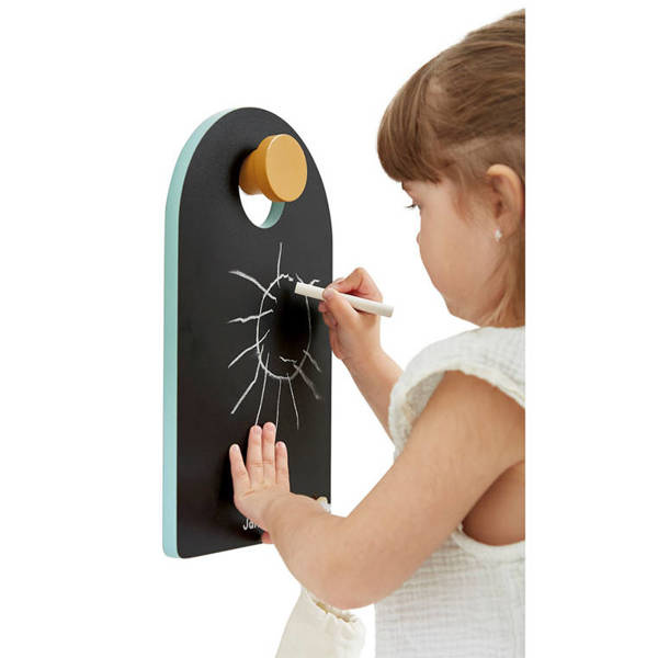 Drewniana przenośna tablica francuskiej marki JANOD to doskonały prezent dla małego ucznia i artysty. Ta dwustronna tablica ma 2 powierzchnie: gładką czarną stronę np. do rysowania i czarną w białe linie do nauki pisania pierwszych słów czy zdań. Ze względu na poręczne rozmiaru jest łatwa do przenoszenia, dzięki czemu można ją zabrać wszędzie! Ale można ją także powiesić na ścianie lub drzwiach pokoju. W zestawie znajduje się bowiem drewniany wieszak, śrubka i kołek. Wśród akcesoriów są ponadto: 3 kredy (biała, niebieska i różowa), gąbka do zmazywania z drewnianym uchwytem oraz bawełniany woreczek na przechowywanie tych dodatków. Co więcej, woreczek ten dzięki kołeczkowi na końcu zaciskowego sznureczka można zamocować w specjalnym otworze przy tablicy, co znacznie ułatwia utrzymanie porządku. Tablica ma zaokrąglony u góry kształt i oryginalny niebieski brzeg. Zabawka rozwija wyobraźnię, zdolności manualne i artystyczne dziecka. Pomaga w nauce pisania i liczenia, jest doskonałym narzędziem do nauki i ozdobą pokoju dziecka.