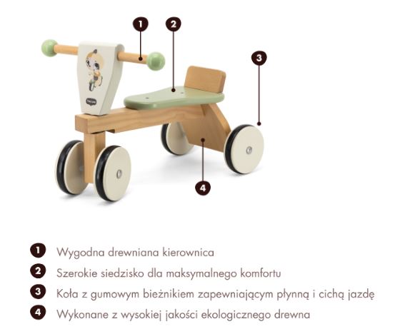 Zbudowany z drewna rowerek jest wyposażony w szerokie siedzisko, gumowe koła i wygodny uchwyt, dzięki czemu idealnie nadaje się do użytku wewnątrz jak i na zewnątrz pomieszczeń.