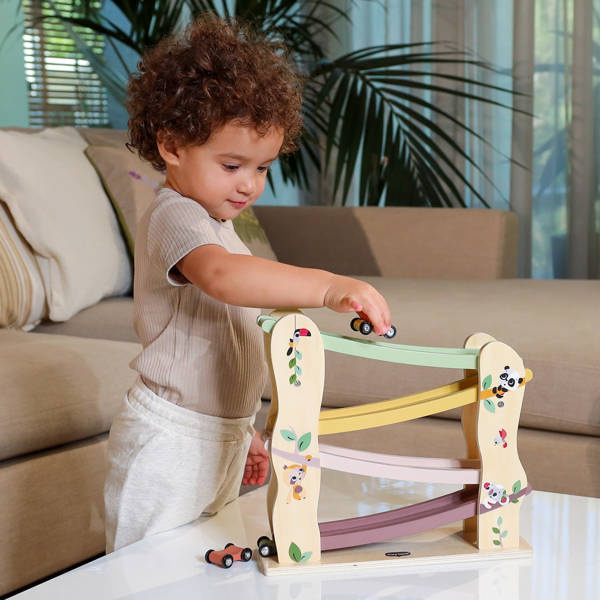 Dzięki projektowi inspirowanemu naturą, rampa i jej 4 samochodziki uczą cudów grawitacji i ruchu! Drewniane samochodziki zjeżdżające po rampie w zabawny i przystępny sposób uczą dzieci zasad ruchu i grawitacji.