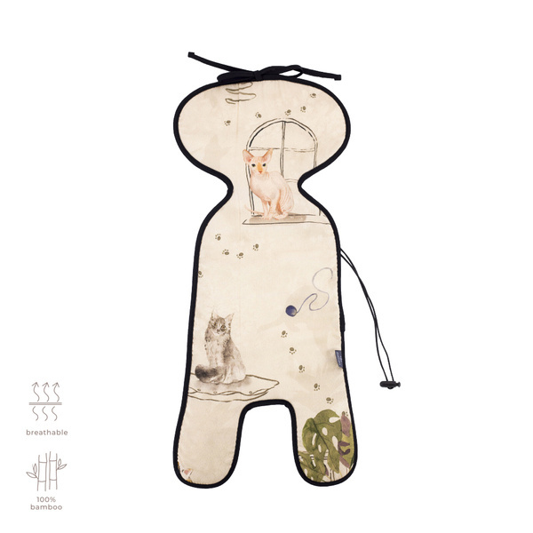 Jedna strona wkładki wykonana jest ze 100% tkaniny bambusowej, druga z dzianiny dystansowej. Wkładka posiada w górnej części gumkę i troczki służące do przymocowania jej do fotelika, tak by była bezpieczna i nie przemieszczała się podczas jazdy.
