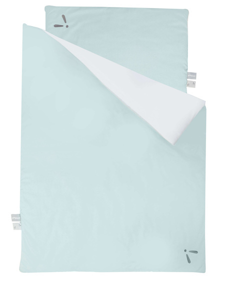 Delikatne, bezpieczne dla skóry niemowlęcia powłoczki z gładkiej bawełny satynowej wypełniliśmy hipoalergicznym włóknem poliestrowym, uzyskując lekką kołderkę (80 x 100 cm) i jeszcze lżejszą płaską poduszeczkę (40 x 60 cm).