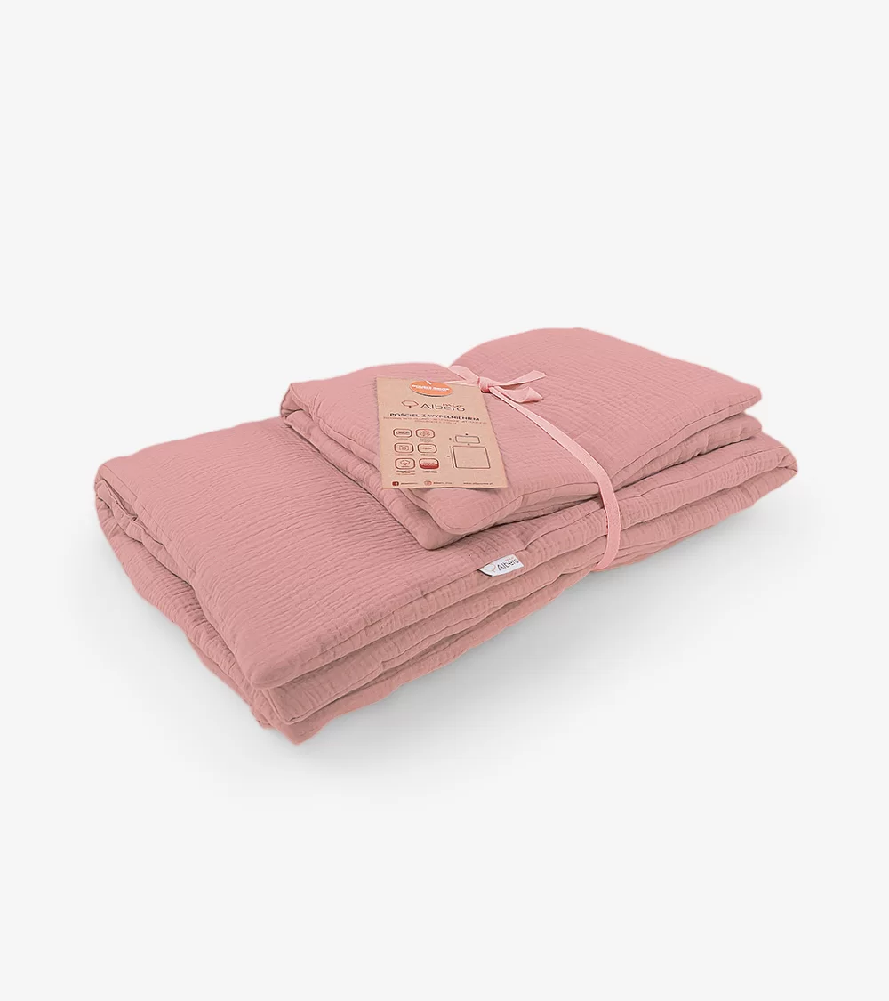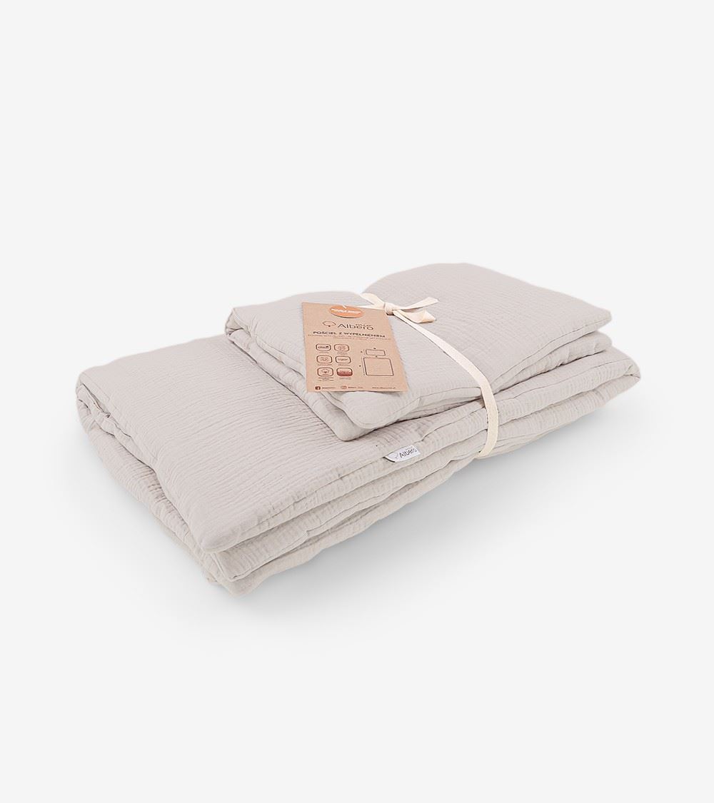 Kołdra i poduszka posiadają wszytą na stałe antyaergiczną, oddychającą włókninę, która zapewnia wygodę i ciepło podczas snu. Jest lekka i miła w użytkowaniu oraz nie traci swojej puszystości pomimo prania. Rozwiązanie wszytego na stałe wypełnienia sprawia, że zestaw nie posiada zamka błyskawicznego, który może podrażniać skórę dziecka.