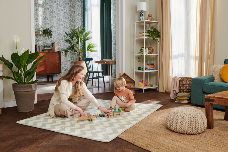 MATTY 2 dopasujesz do wystroju wnętrza swojego domu. Na jednej stronie znajduje się zachęcający do zabawy i snucia opowieści wzór, na drugiej zaś widnieje stonowany, geometryczny design. MATTY 2 będzie pasować zarówno do pokoju dziecięcego, jak i do salonu.