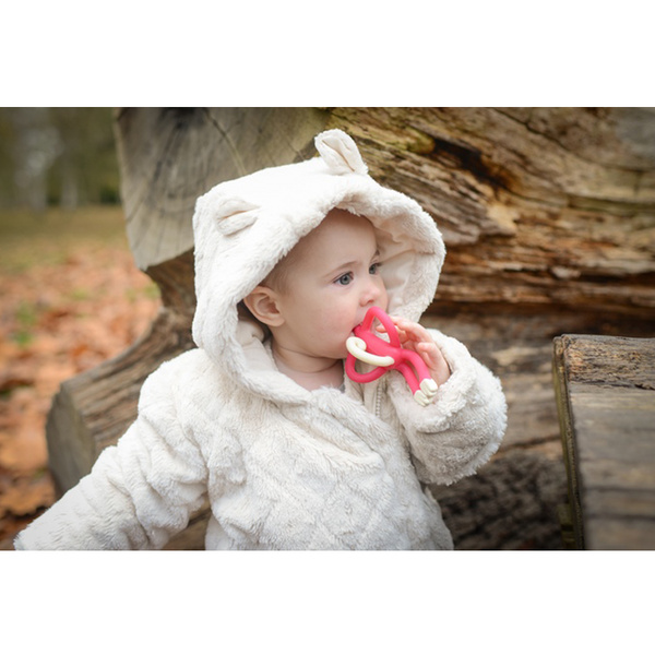 Monkey zwiększają ukrwienie dziąseł podczas ząbkowania dzięki czemu łagodzą podrażnienia i bóle rozwojowe. Z tyłu główki małpki znajdują się delikatna w dotyku, mięciutka silikonowa szczoteczka. Dzięki temu możemy podać maluszkowi żele chłodzące, jak również w późniejszym okresie pastę do zębów.