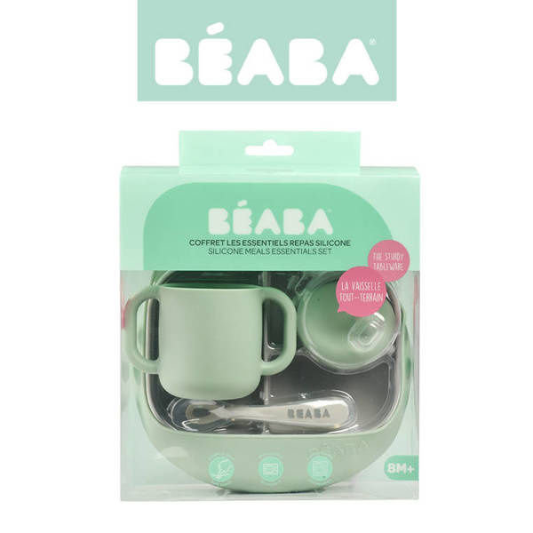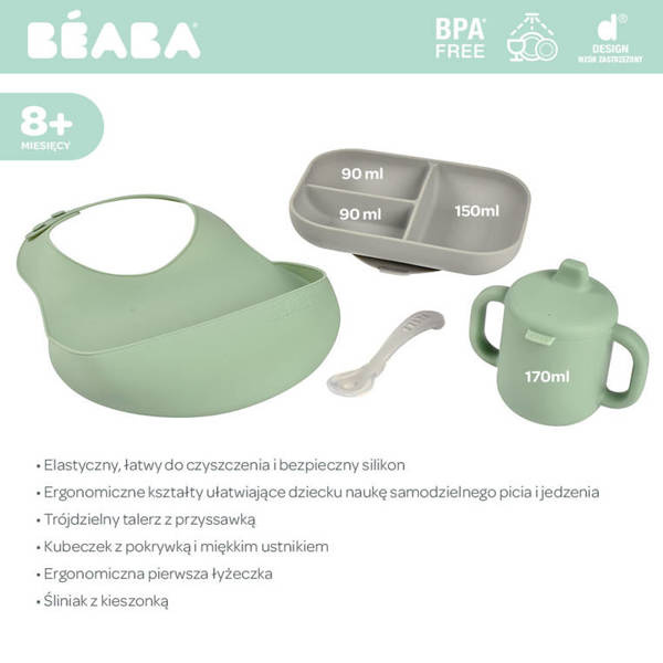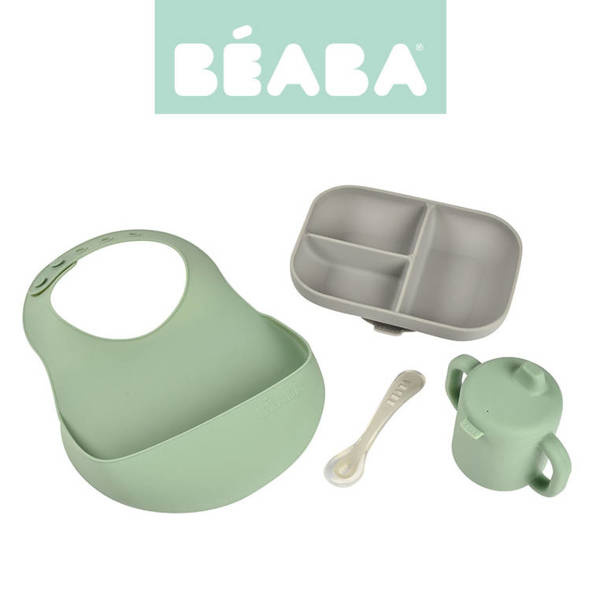 Beaba Beaba Silikonowy Zestaw do Posiłków Talerzyk Trójdzielny z Przyssawką, Kubek z Dziubkiem, Łyżeczka i Śliniak