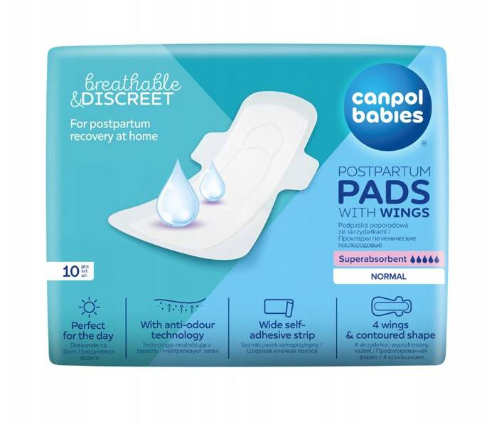 Superchłonne podpaski poporodowe Canpol babies są idealnym rozwiązaniem dla kobiet w czasie połogu do użytkowania w domu po wyjściu ze szpitala. Podpaski poporodowe są cieńsze i dyskretniejsze niż podkłady poporodowe, ale również bardzo chłonne i oddychające. Zwykłe podpaski nie sprawdzają się w tej sytuacji. Rozmiar podpaski został dostosowany, tak aby dobrze zabezpieczała przed przeciekaniem.