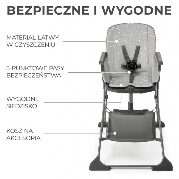 FOLDEE ma duże siedzisko, które wykonano z łatwego w czyszczeniu materiału. Z łatwością usuniesz z niego nawet najbardziej uciążliwe plamy po posiłku. Krzesełko jest bezpieczne: ma 5-punktowe, regulowane pasy, które w razie potrzeby zdejmiesz i wypierzesz. Pod siedziskiem znajduje się kosz na drobiazgi - np. na mokre chusteczki czy zapasowy śliniaczek.