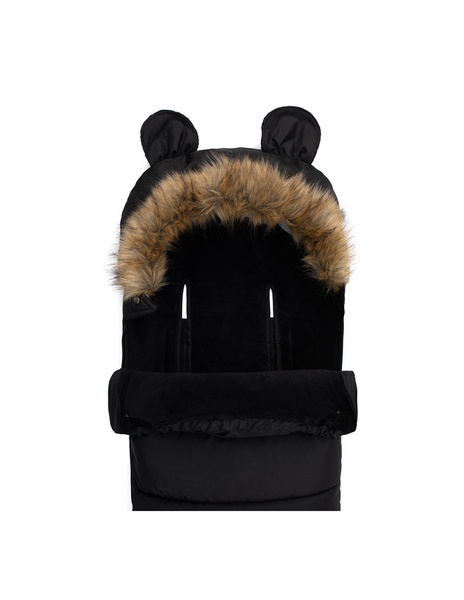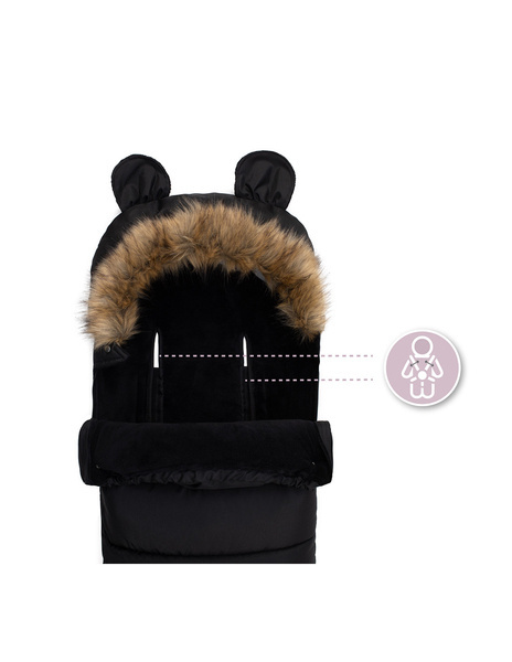 Śpiworek MoMi posiada ciepły kapturek z wesołymi uszkami, który wykończony jest odpinanym futerkiem. Otwory na pasy są natomiast odpowiednie zarówno do tych 3, jak i 5 punktowych.