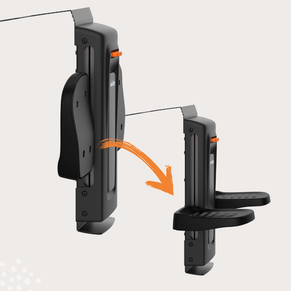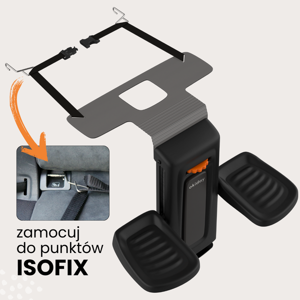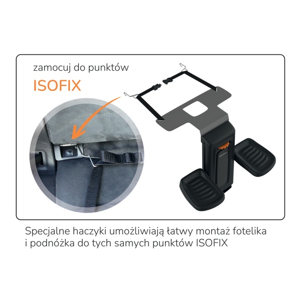 Podnóżki zamocujesz bez problemu w każdym pojeździe wyposażonym w punkty mocowania ISOFIX. Haczyk podnóżka wystarczy zaczepić o ucho punktu ISOFIX w pojeździe, a następnie ściągnąć nadmiar taśmy, by paski były dobrze napięte. Wszystko to intuicyjne i funkcjonalne.