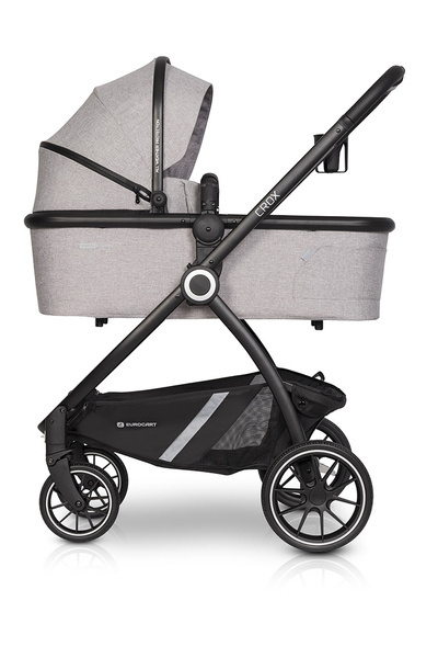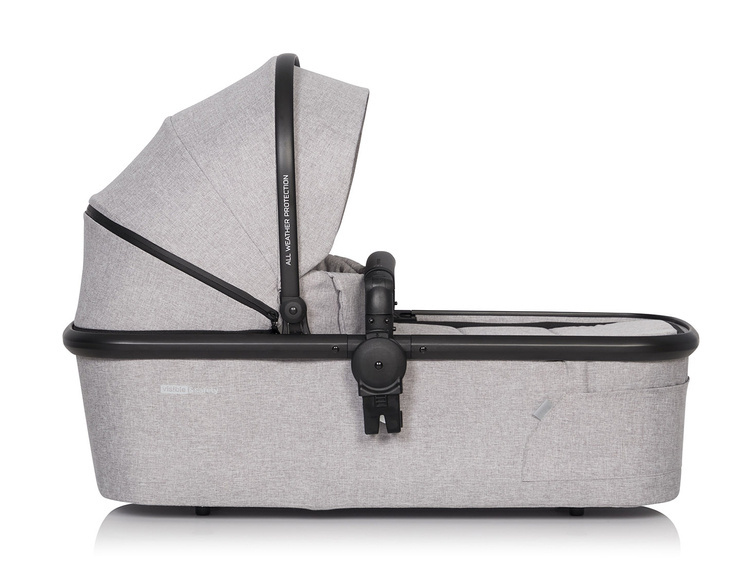 Gondola wózka CROX jest duża i komfortowa. Jej wnętrze wykonane zostało z wysokiej jakości miłej w dotyku bawełny w praktycznym jasno szarym kolorze. Do przenoszenia gondoli służy specjalny uchwyt, który został obszyty skórą ekologiczną.
