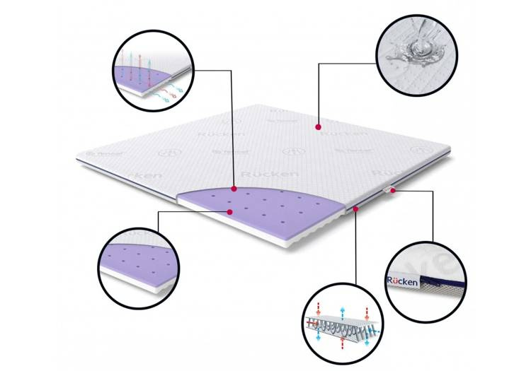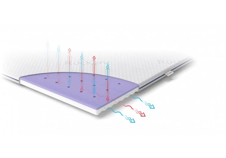 • pionowych kanalików wentylacyjnych: profilu fali nadanemu piance białej. Profil fali z wierzchniej strony zmniejsza twardość pianki po tej stronie z H3 do H2 oraz zapewnia doskonałą cyrkulację powietrza.