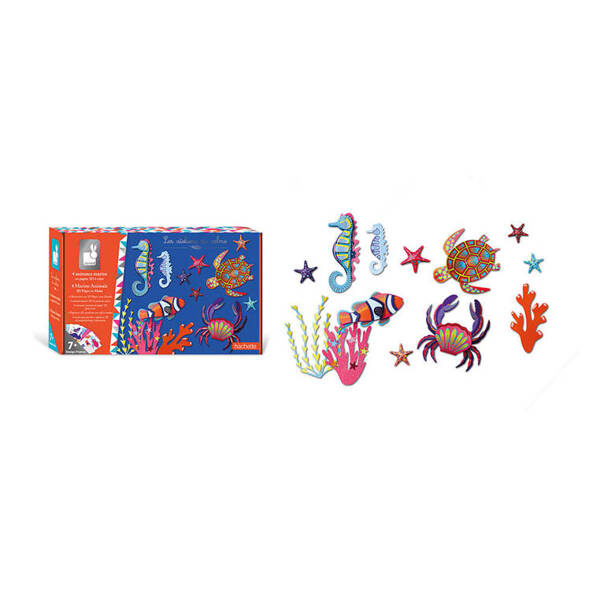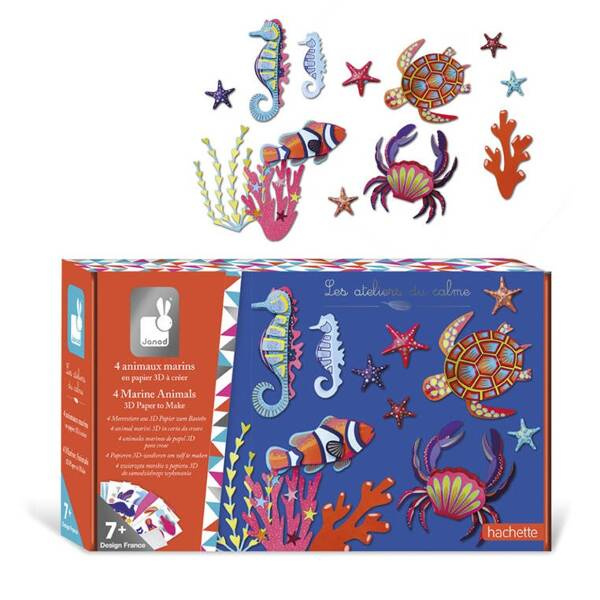 Zestaw kreatywny 4 zwierzęta morskie z papieru 3D francuskiej marki JANOD pozwoli stworzyć łącznie 4 rodzaje morskich żyjątek (koniki morskie, kraba, żółwia i rybkę) i inne elementy ich podwodnego świata (rozgwiazdy, koralowce, wodorosty).