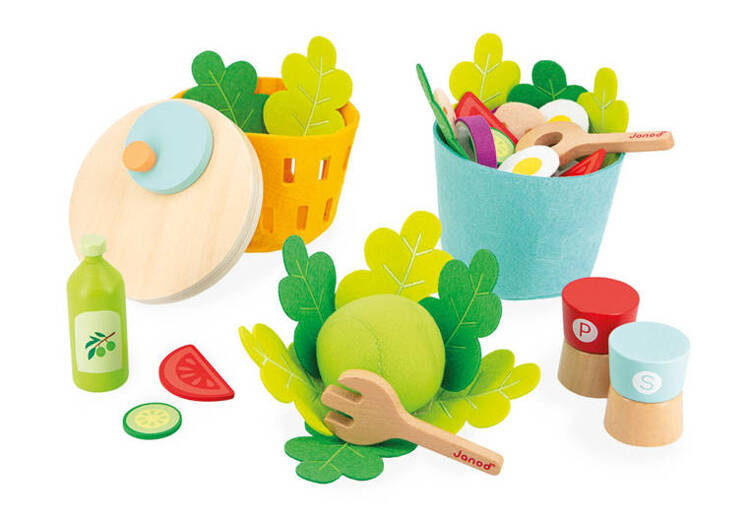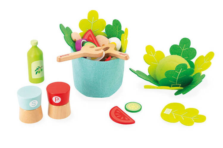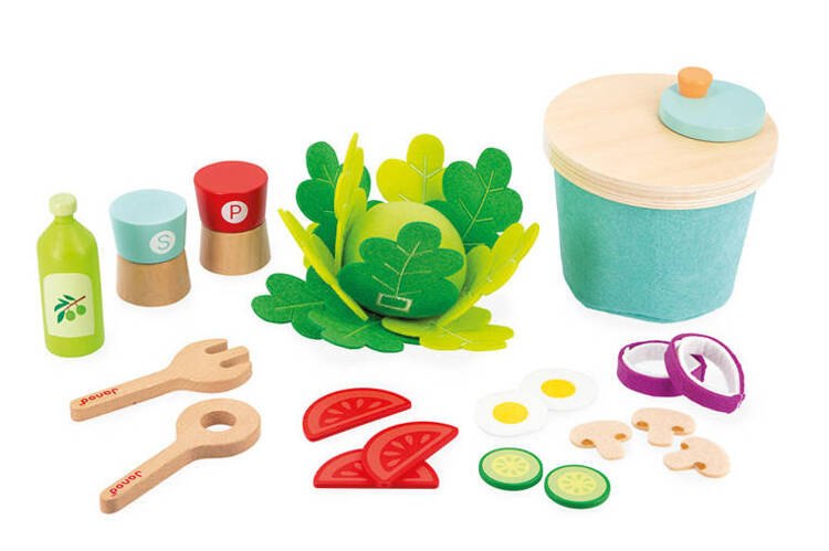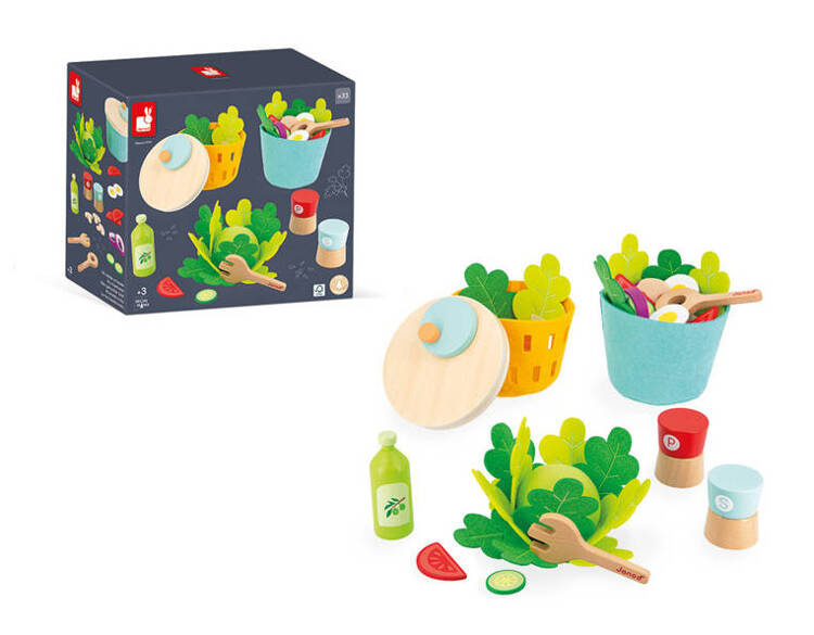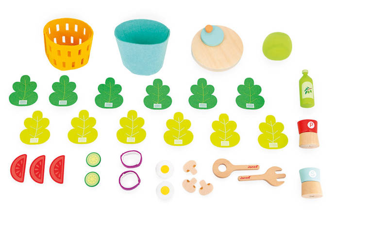 W skład 30-elementowego zestawu wchodzą: filcowa miska i filcowa suszarka z drewnianą pokrywką z pokrętłem, główka sałaty z 12 listkami, mocowanymi na rzepy, 3 plasterki pomidora, 2 plasterki ogórka, 2 plasterki cebuli, 2 jajka sadzone i 3 grzybki – wszystko wykonane z filcu, a także komplet sztućców do sałatek, drewniane pieprzniczka i solniczka z młynkami (wydają dźwięki) oraz butelka oliwy z oliwek.