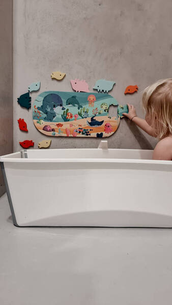 Puzzle do kąpieli Ocean francuskiej marki JANOD to aż 28 puzzli z wodoodpornego tworzywa. Po ułożeniu przedstawiają podwodny świat, pełen pięknych stworzeń, m.in. ławicę kolorowych rybek, delfina, rodzinę żółwi, kraba czy konika morskiego.