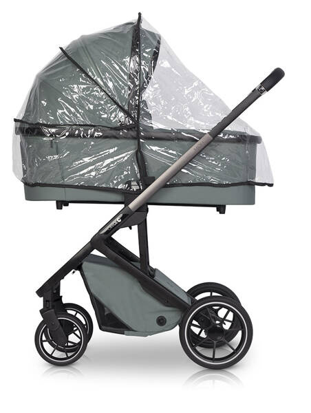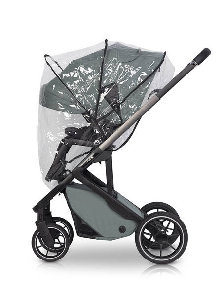 W zestawie z wózkiem w wersji spacerowej otrzymujesz pokrowiec przeciwdeszczowy, moskitierę i ocieplacz na zimę.